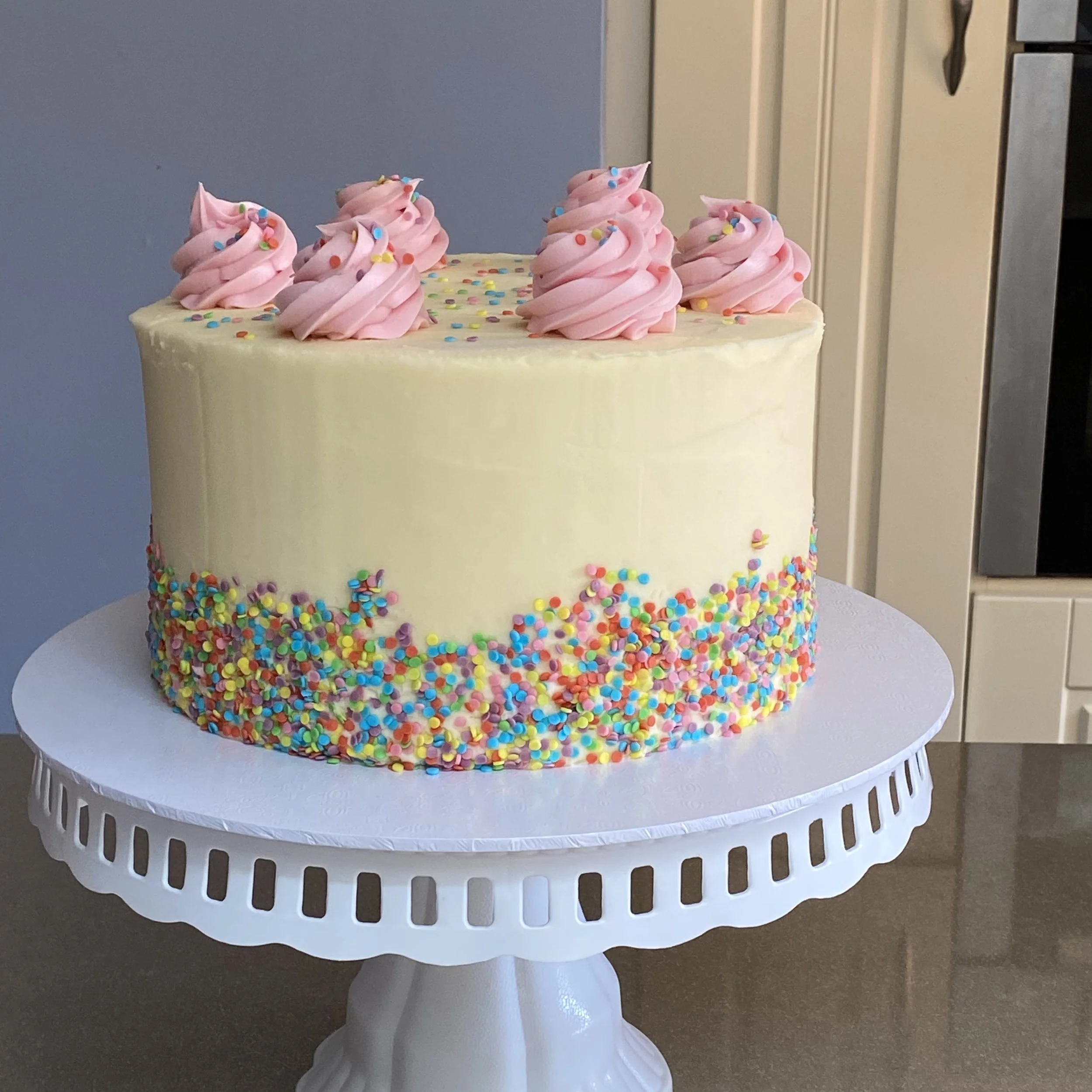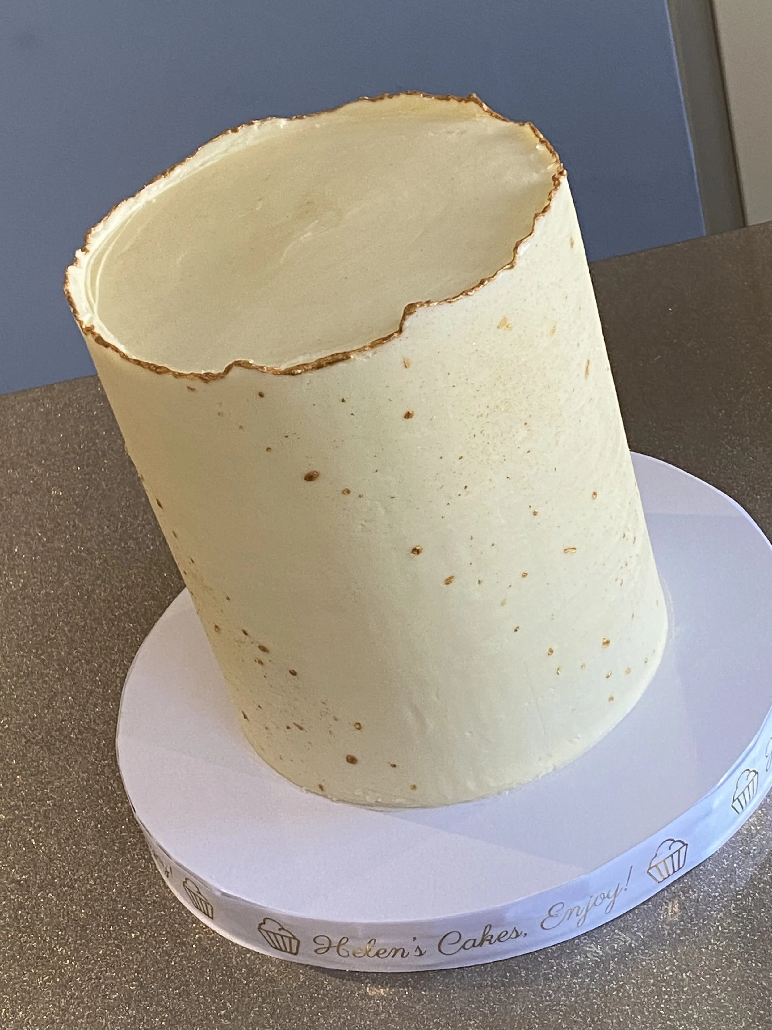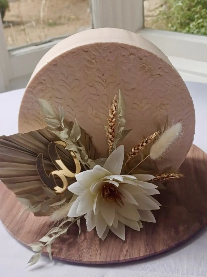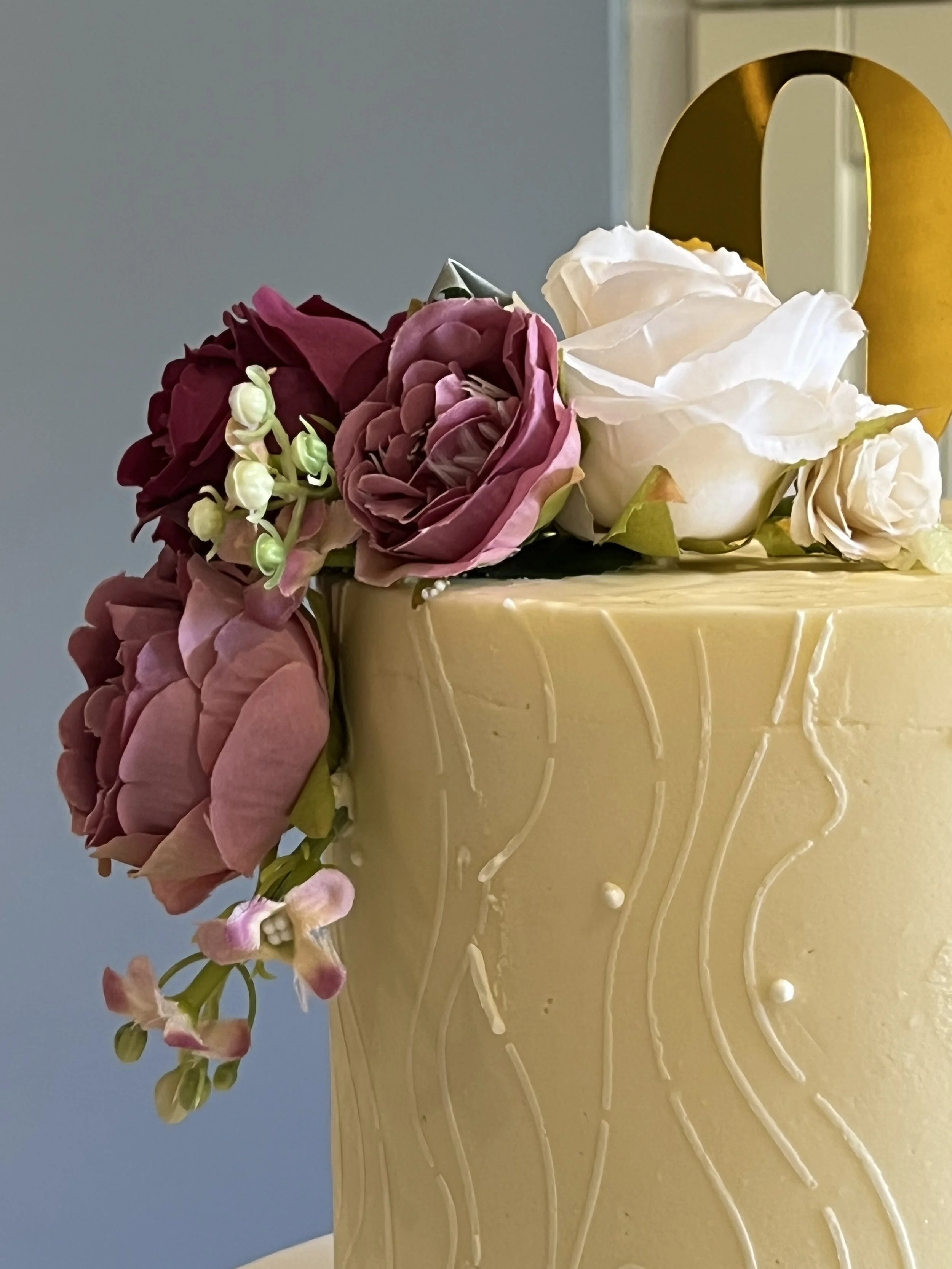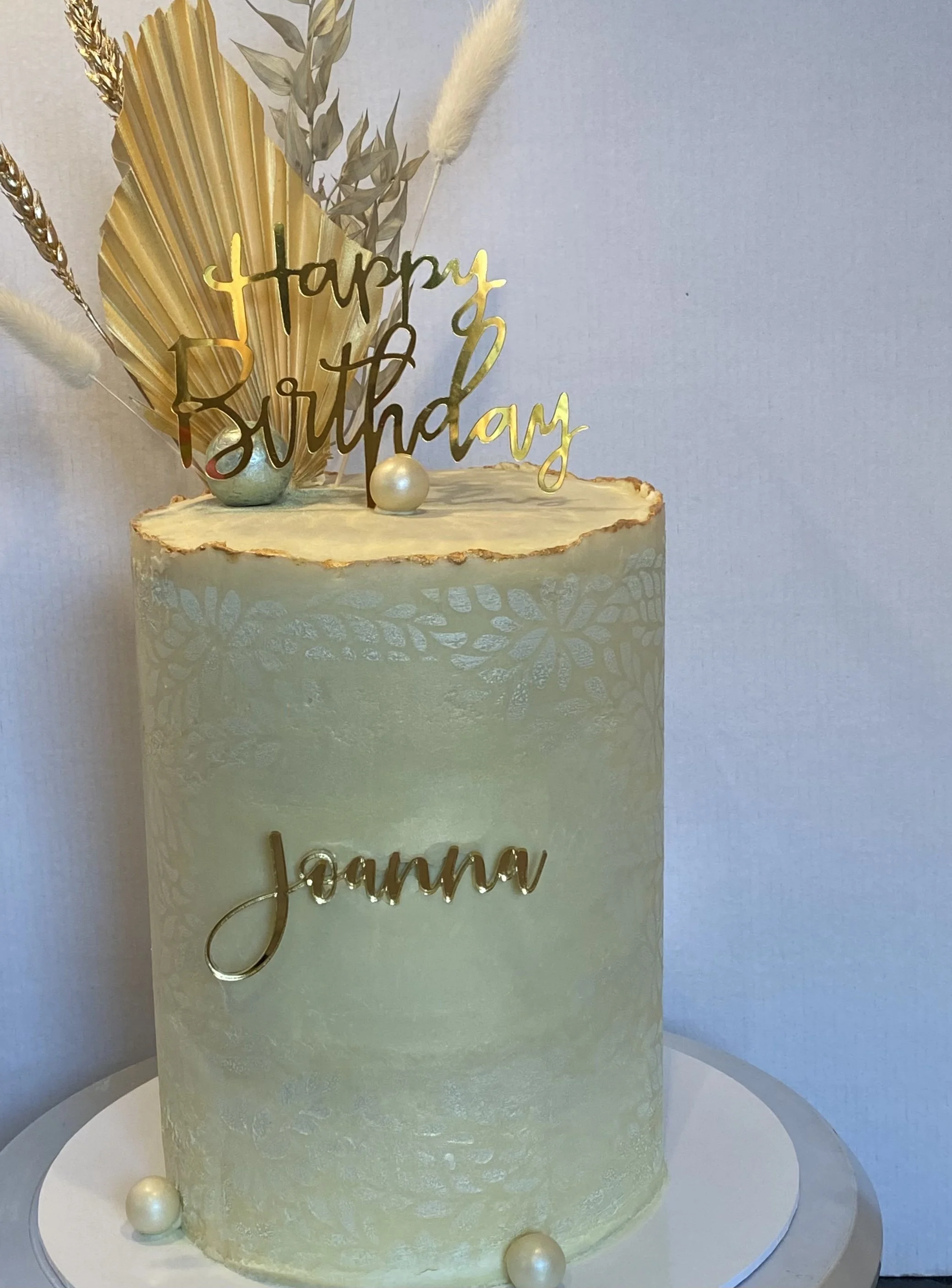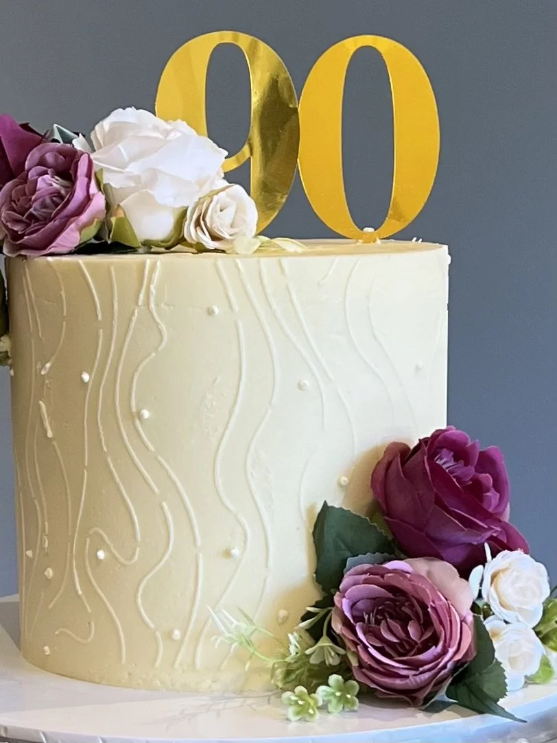 Simple Buttercream covered and gold speckles, add our own toppers and floral decorations.