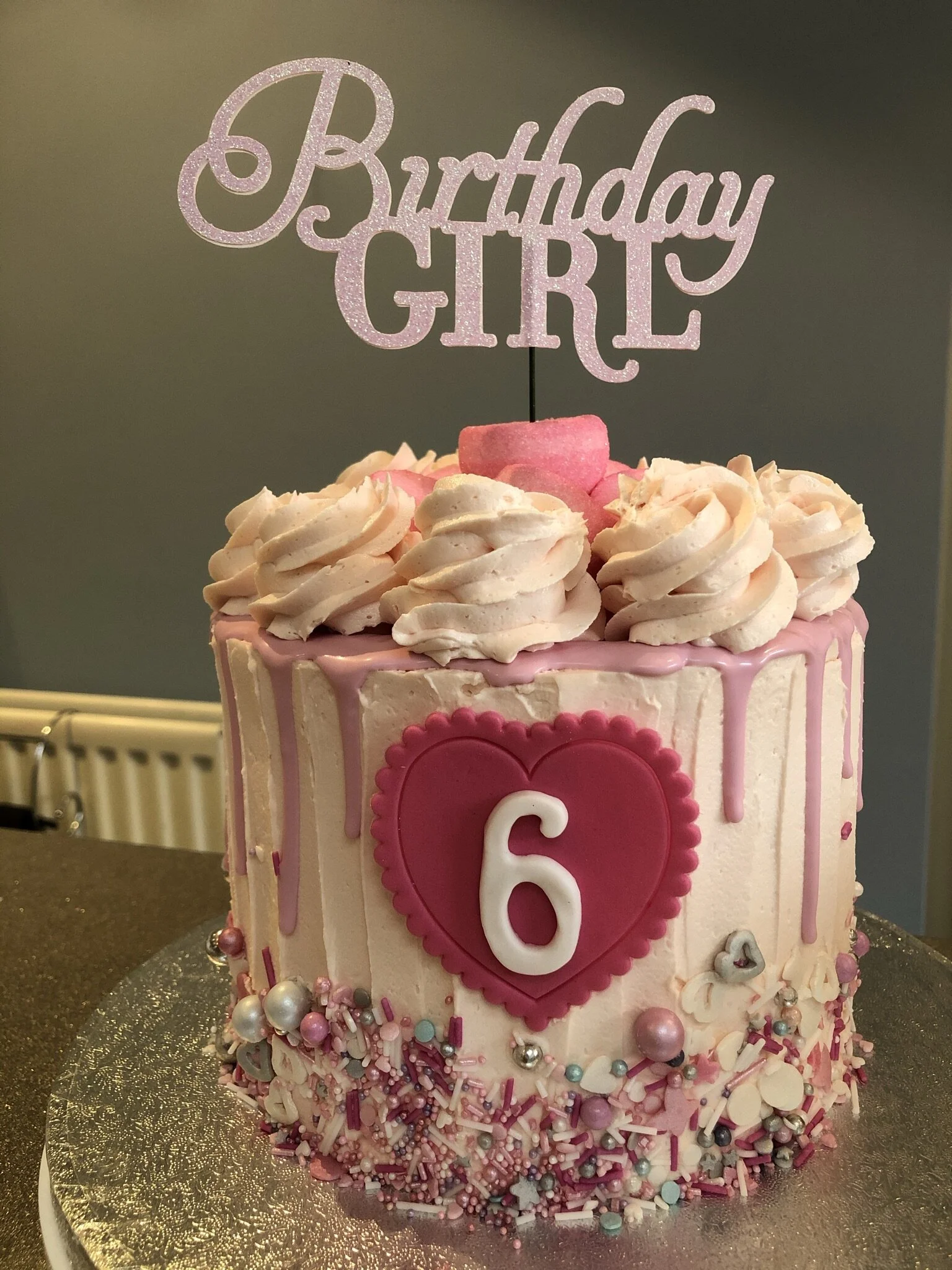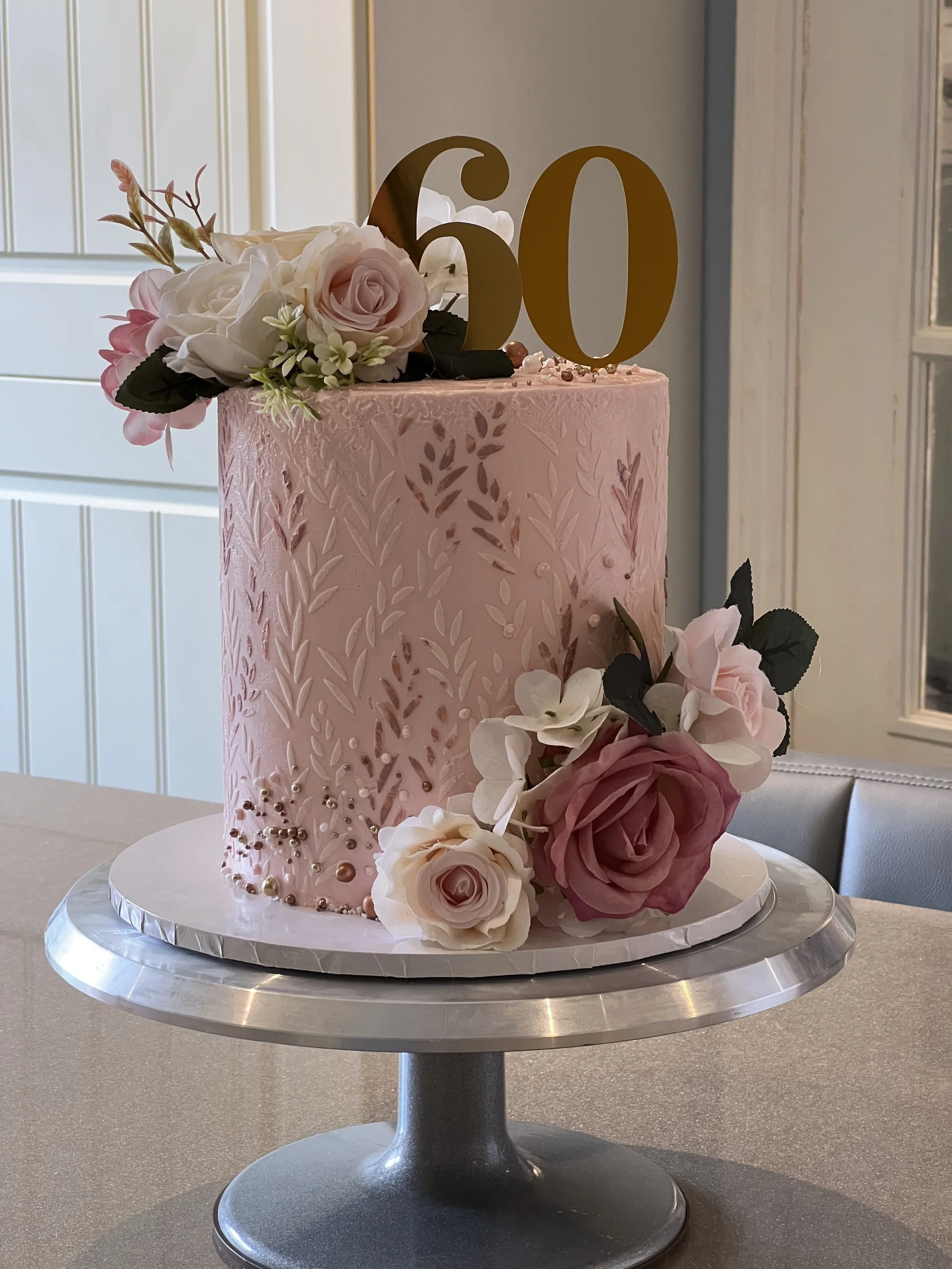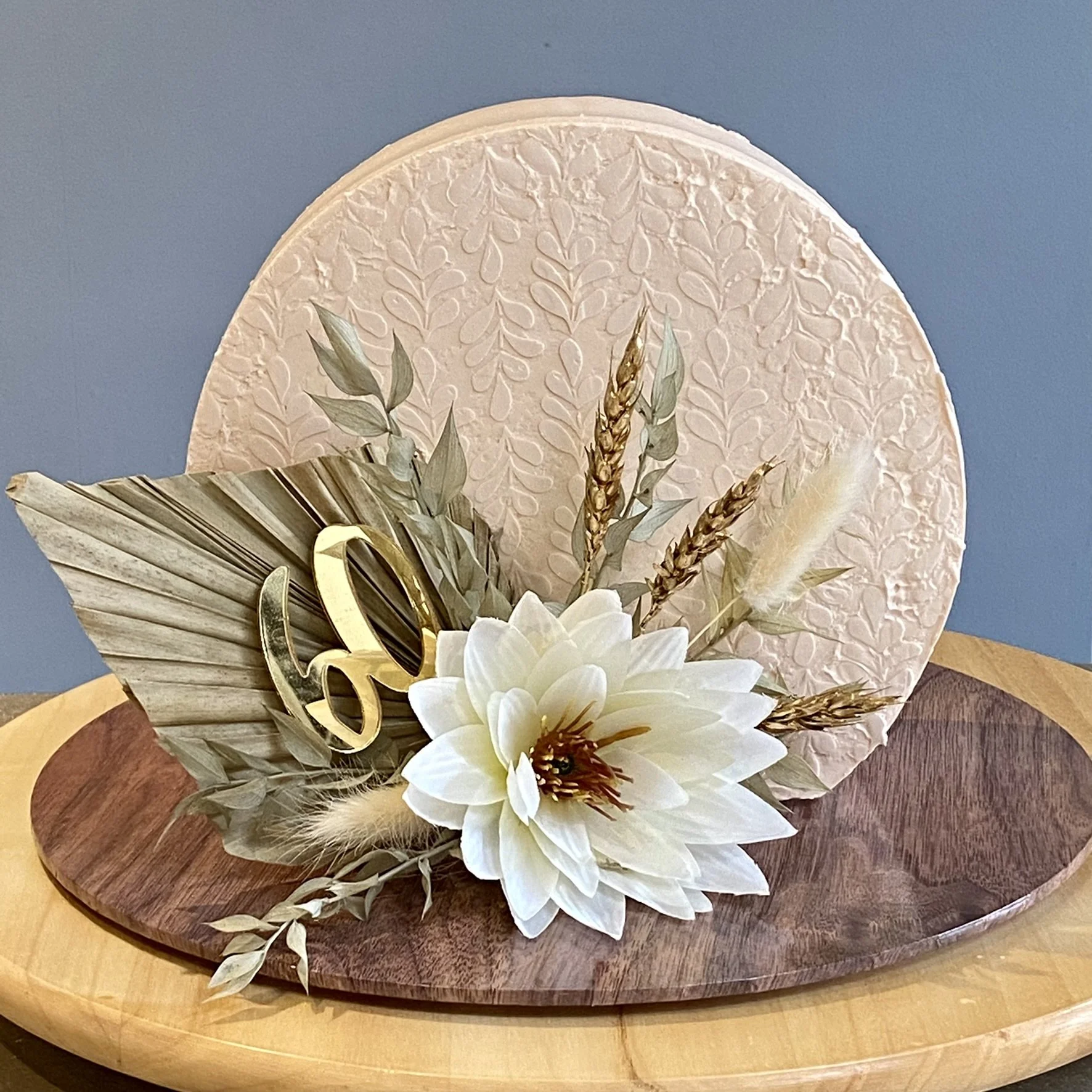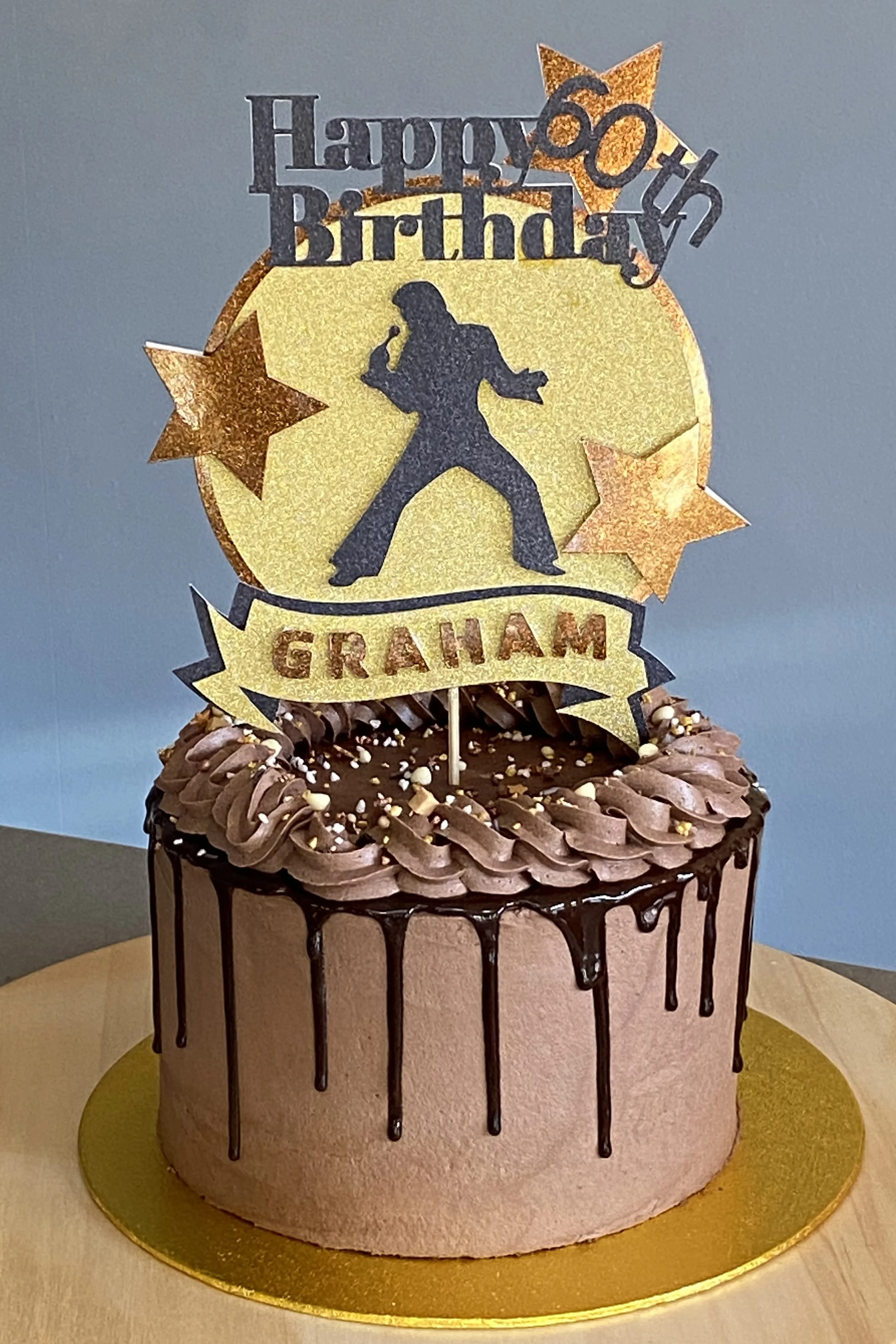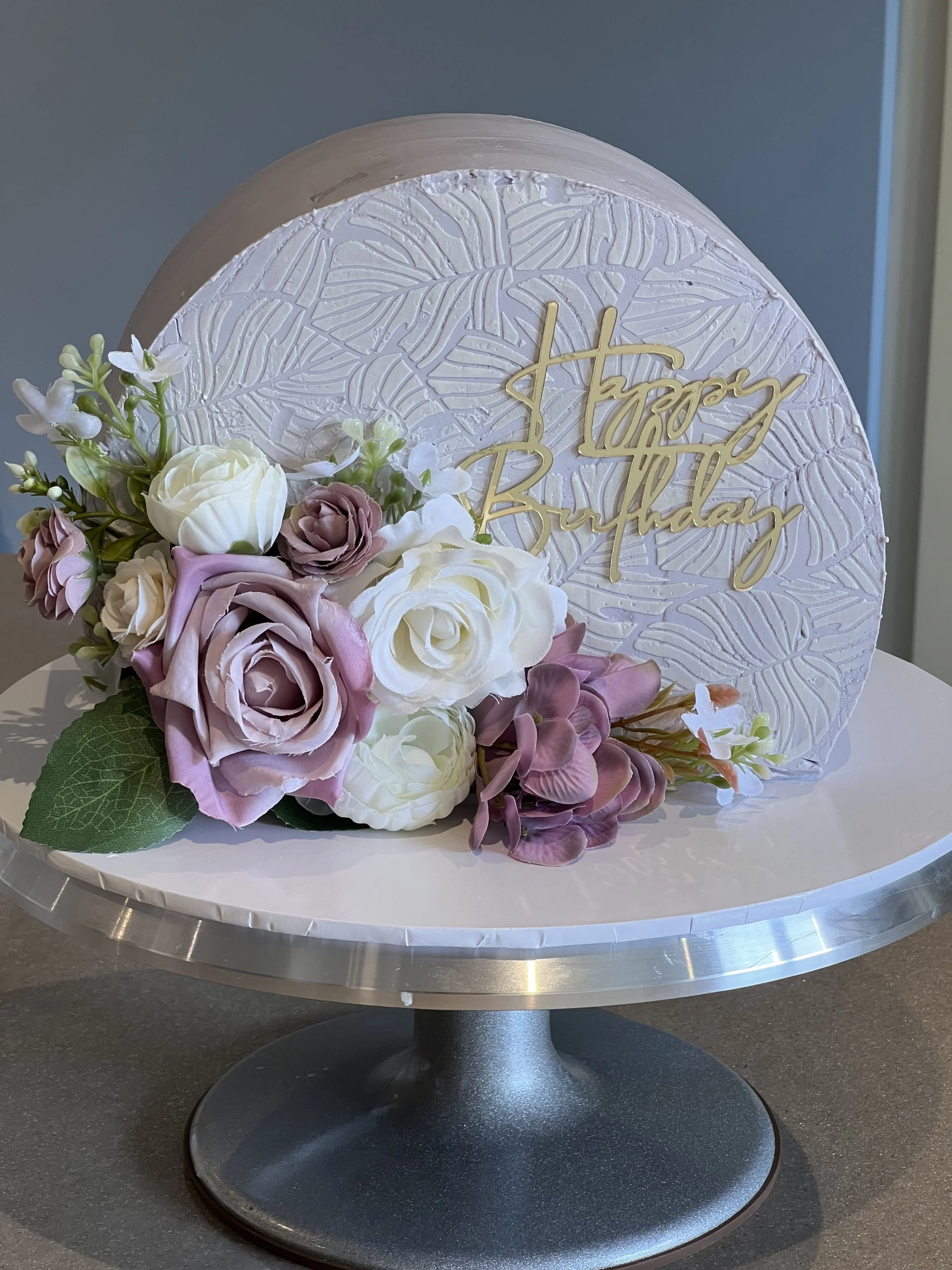 Simple Buttercream covered and gold speckles, add our own toppers and floral decorations.