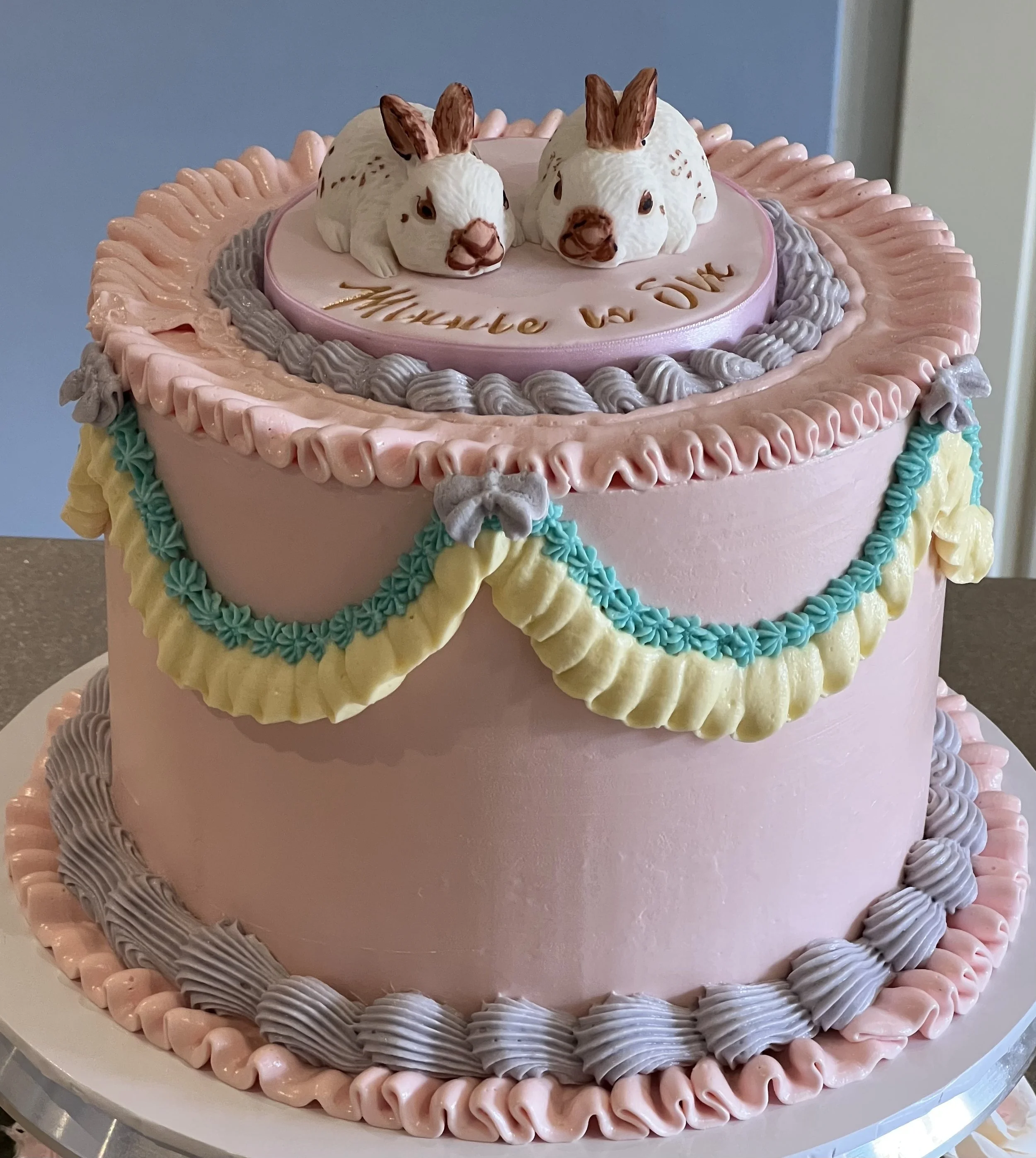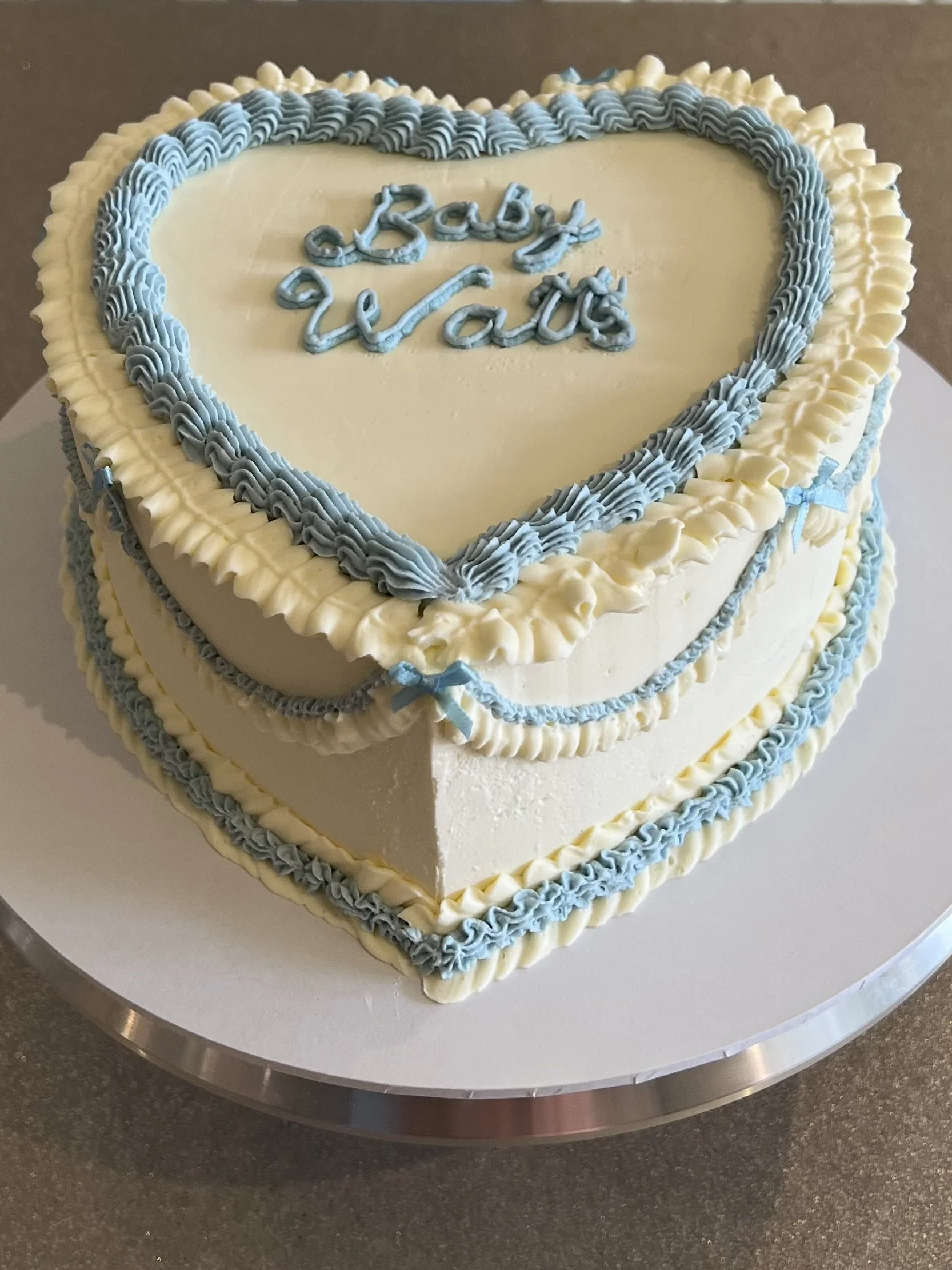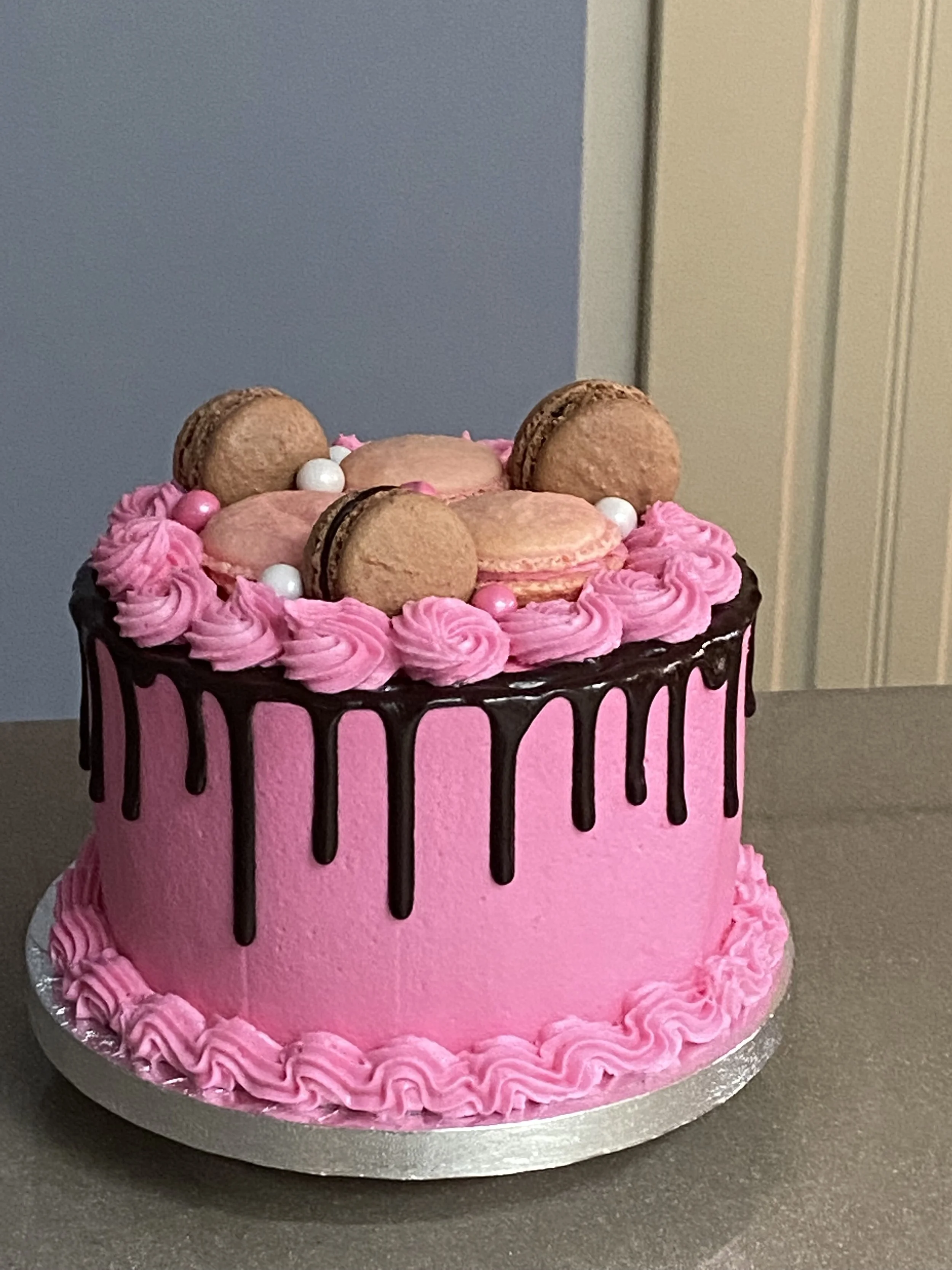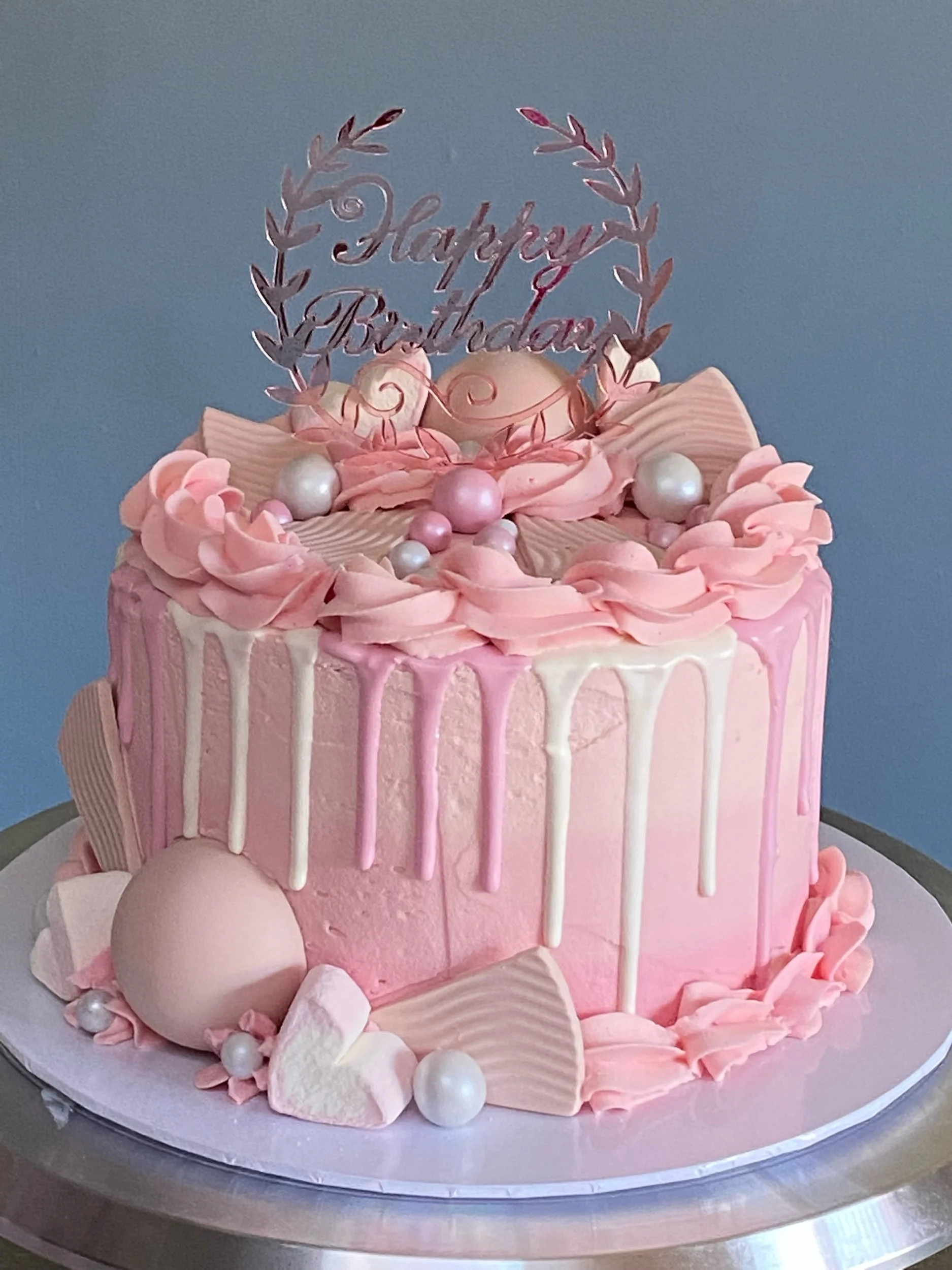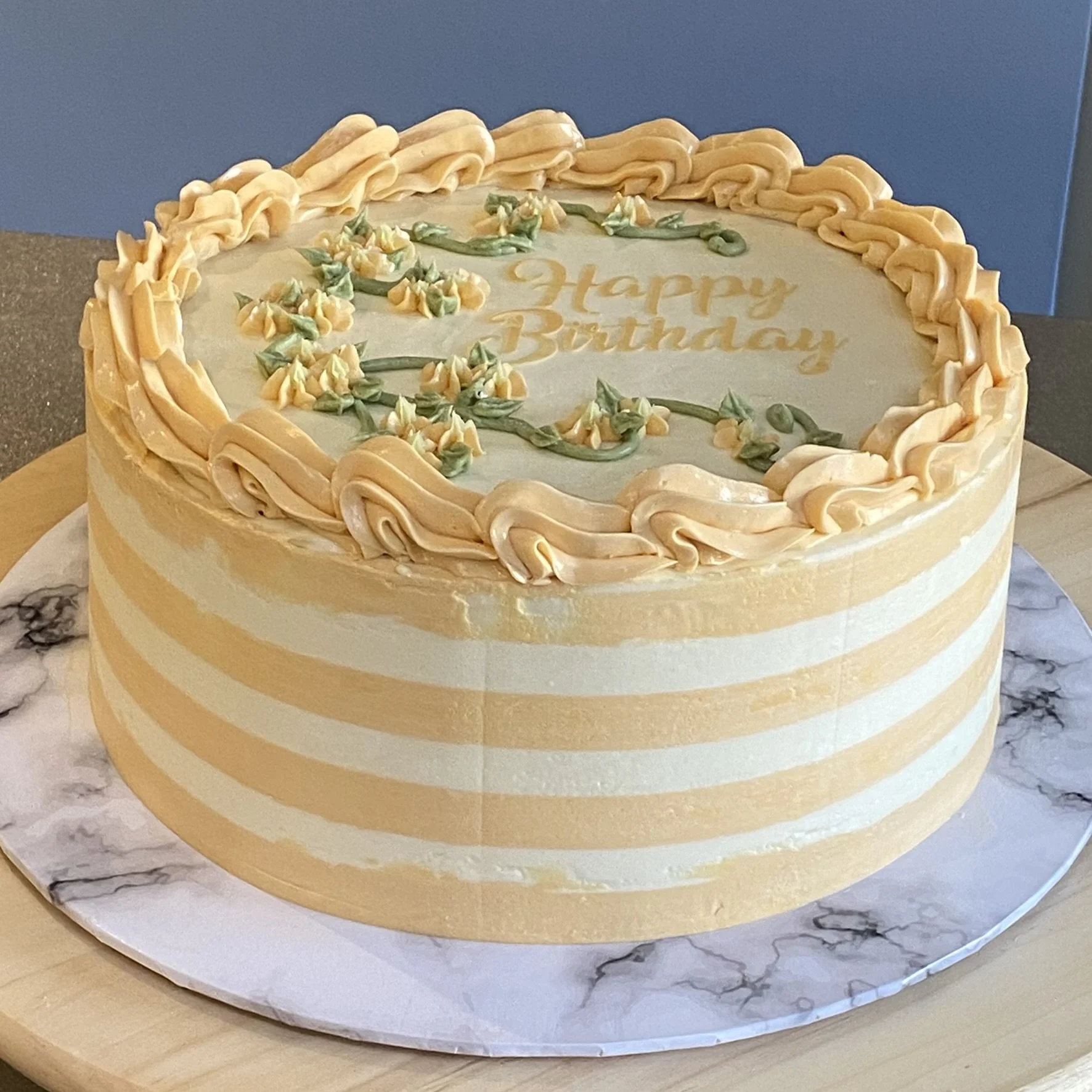 Simple Buttercream covered and gold speckles, add our own toppers and floral decorations.