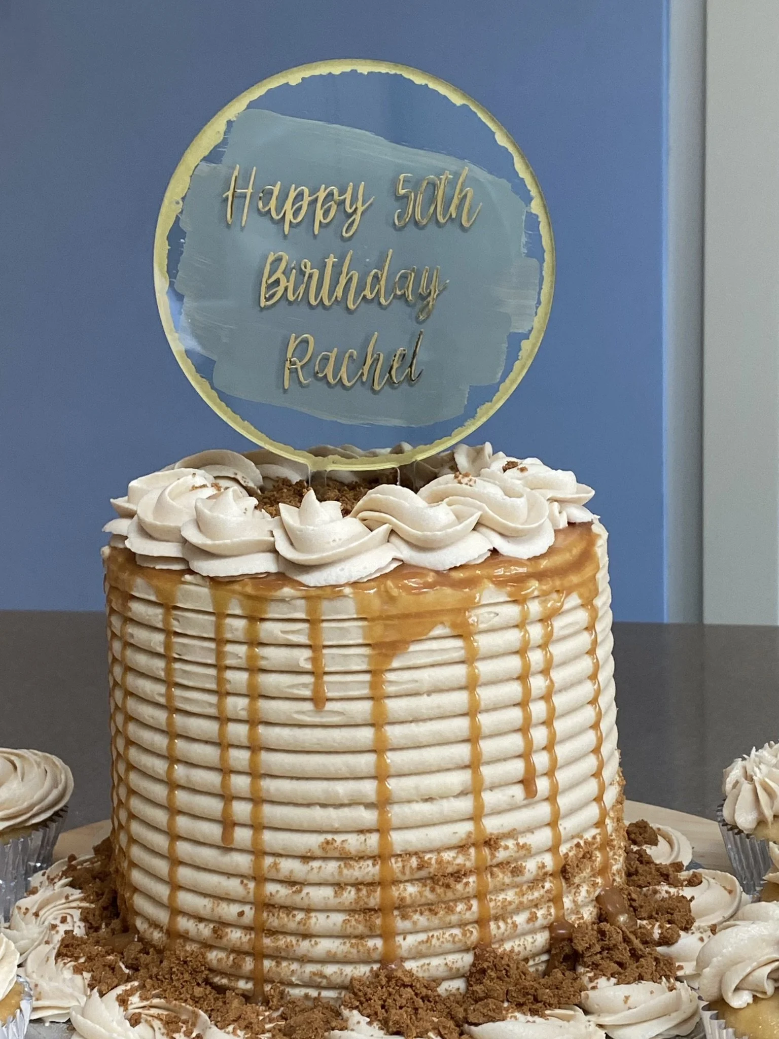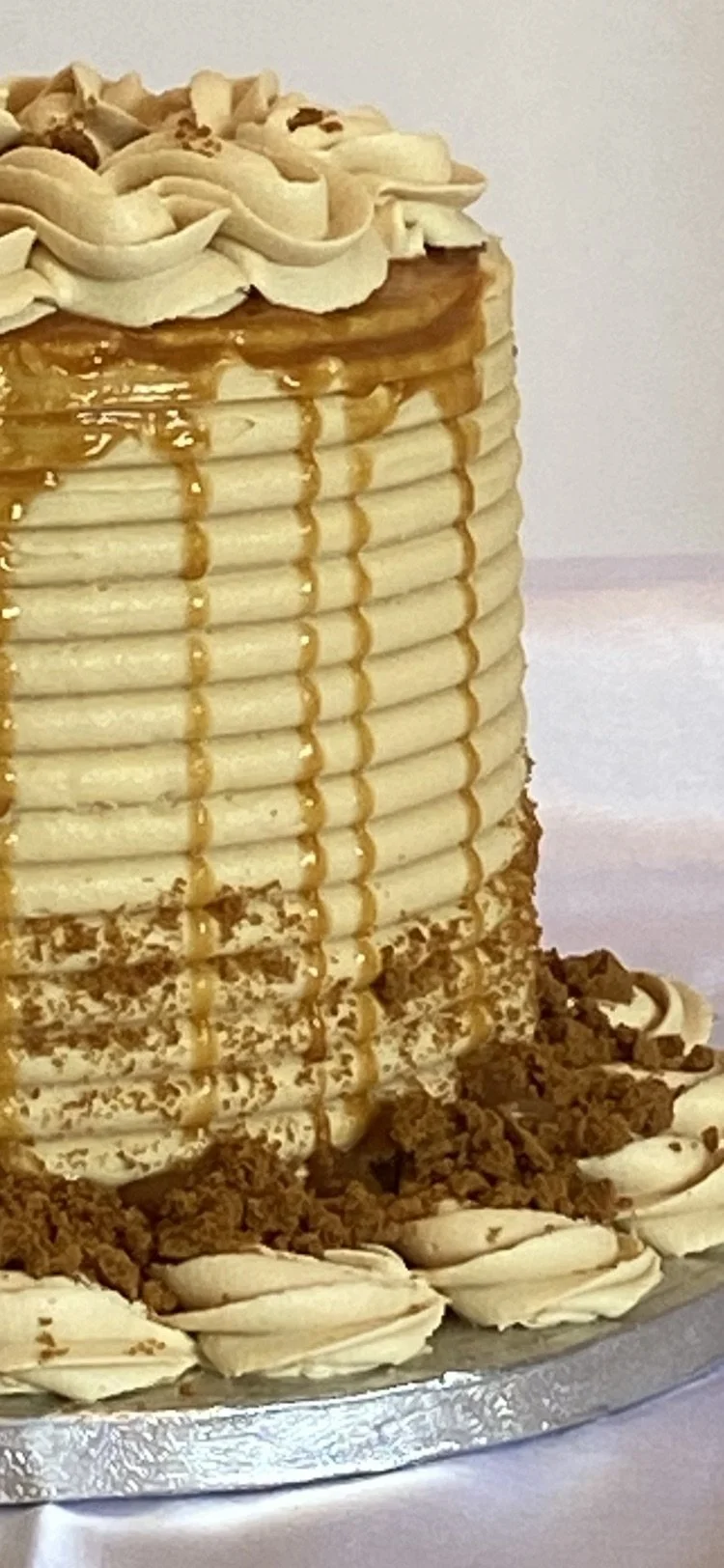 Heavenly Lotus Biscoff Celebration cake with caramel drip, smooth biscoff filing and crumb decoration.