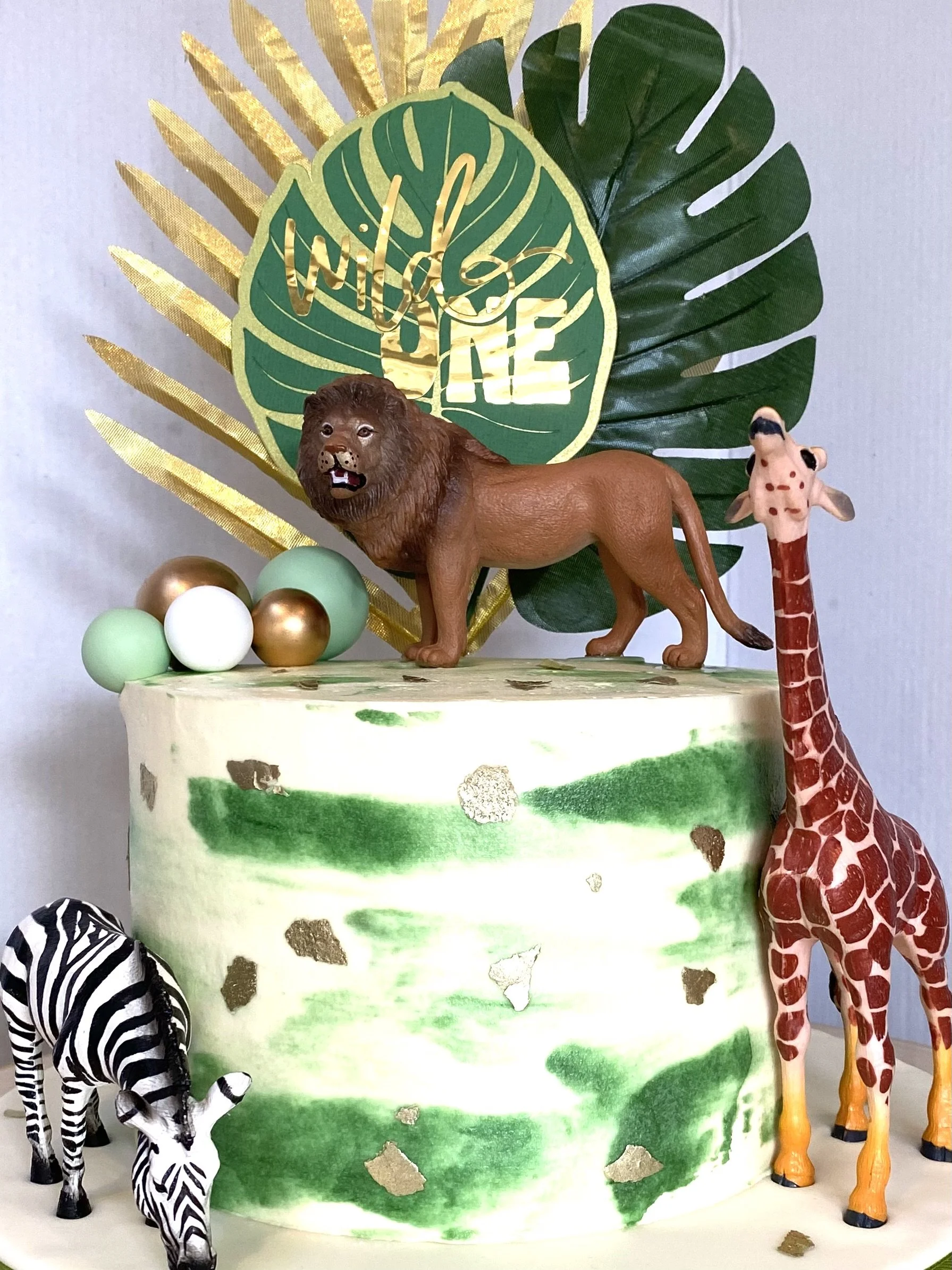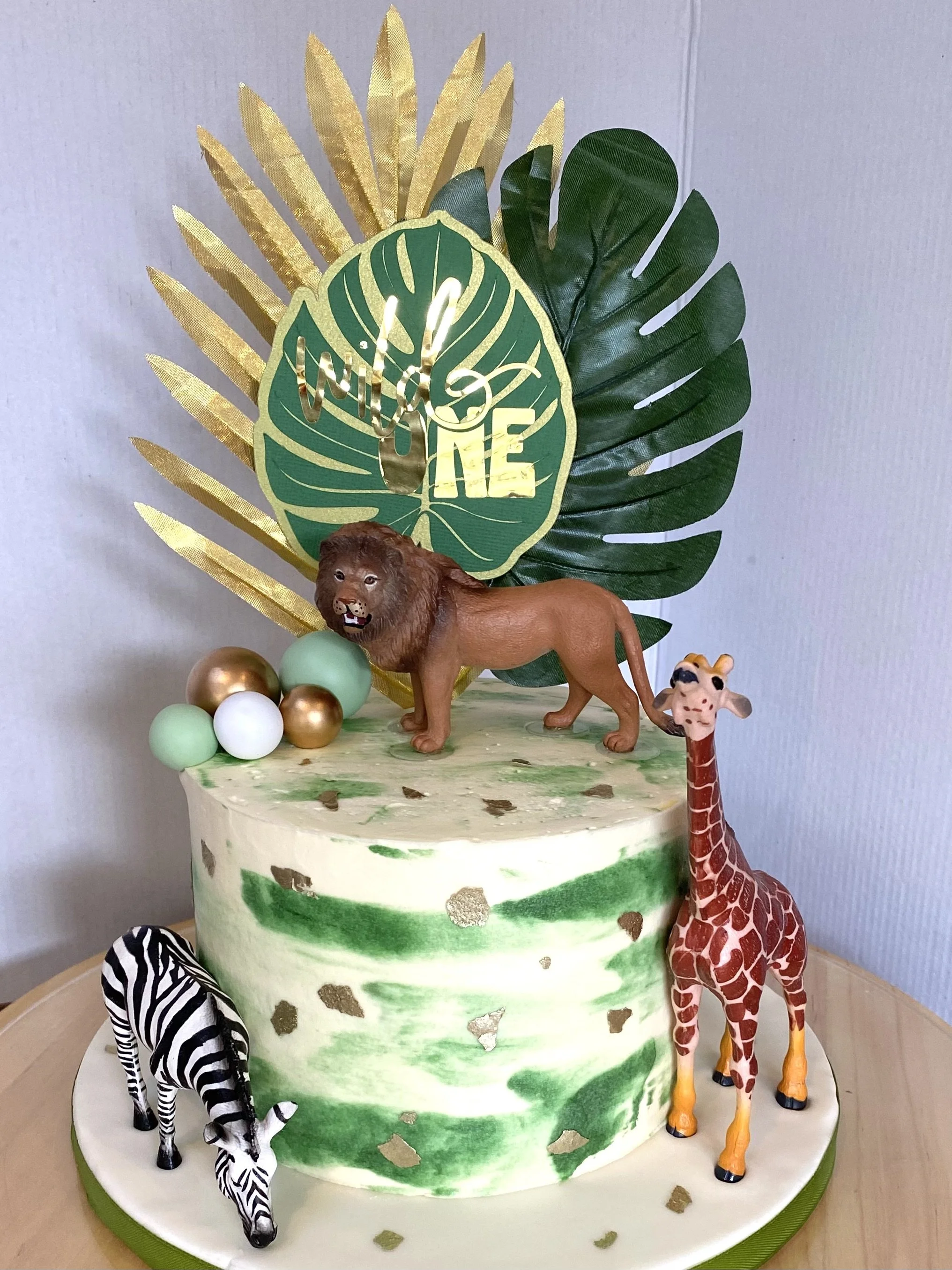 Wild One, Themed Birthday cake with toy lion, giraffe and zebra.
