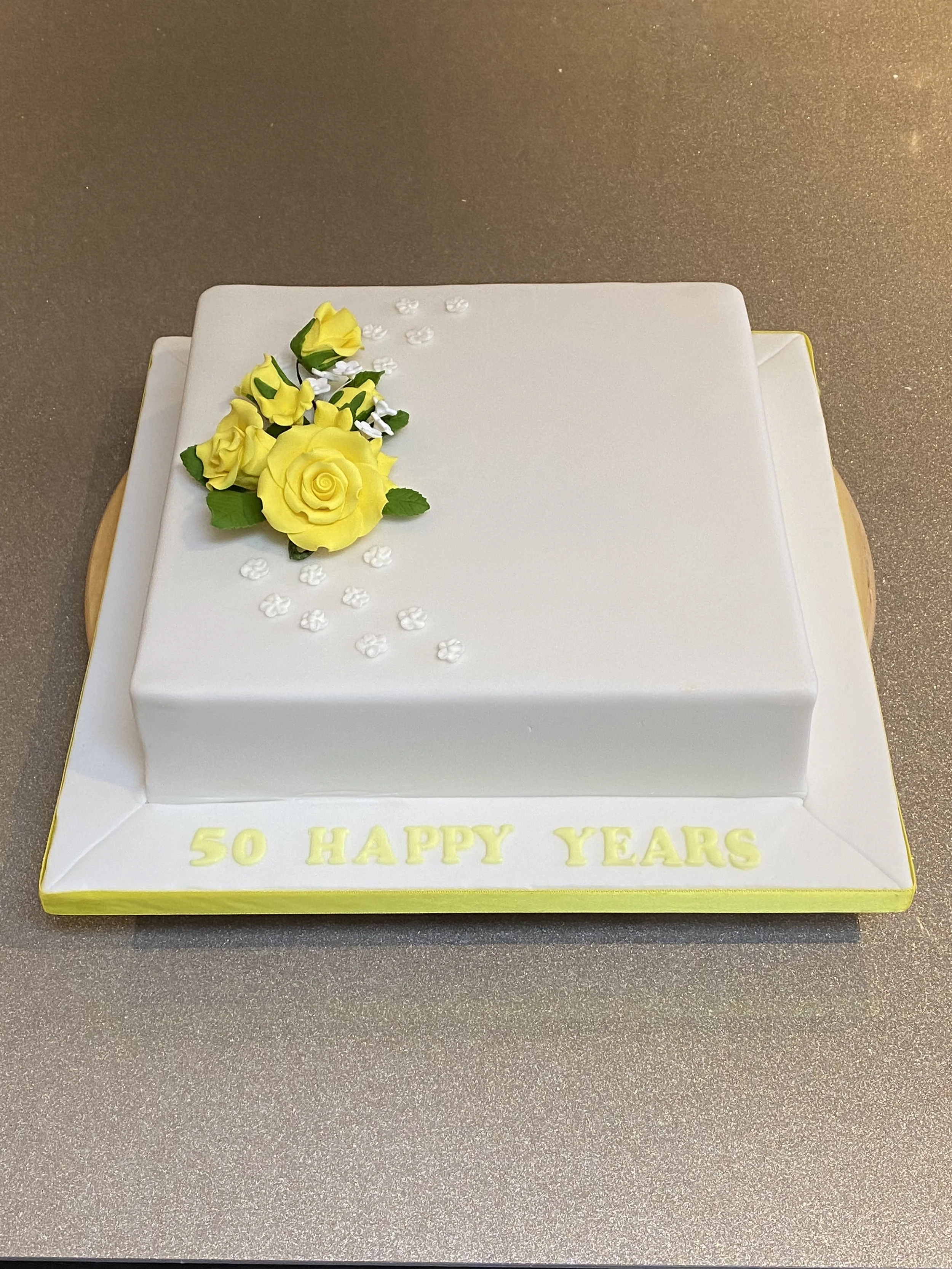 50 Happy Years, Golden Anniversary cake, with floral topper and white sugar paste fondant covering on a square cake.