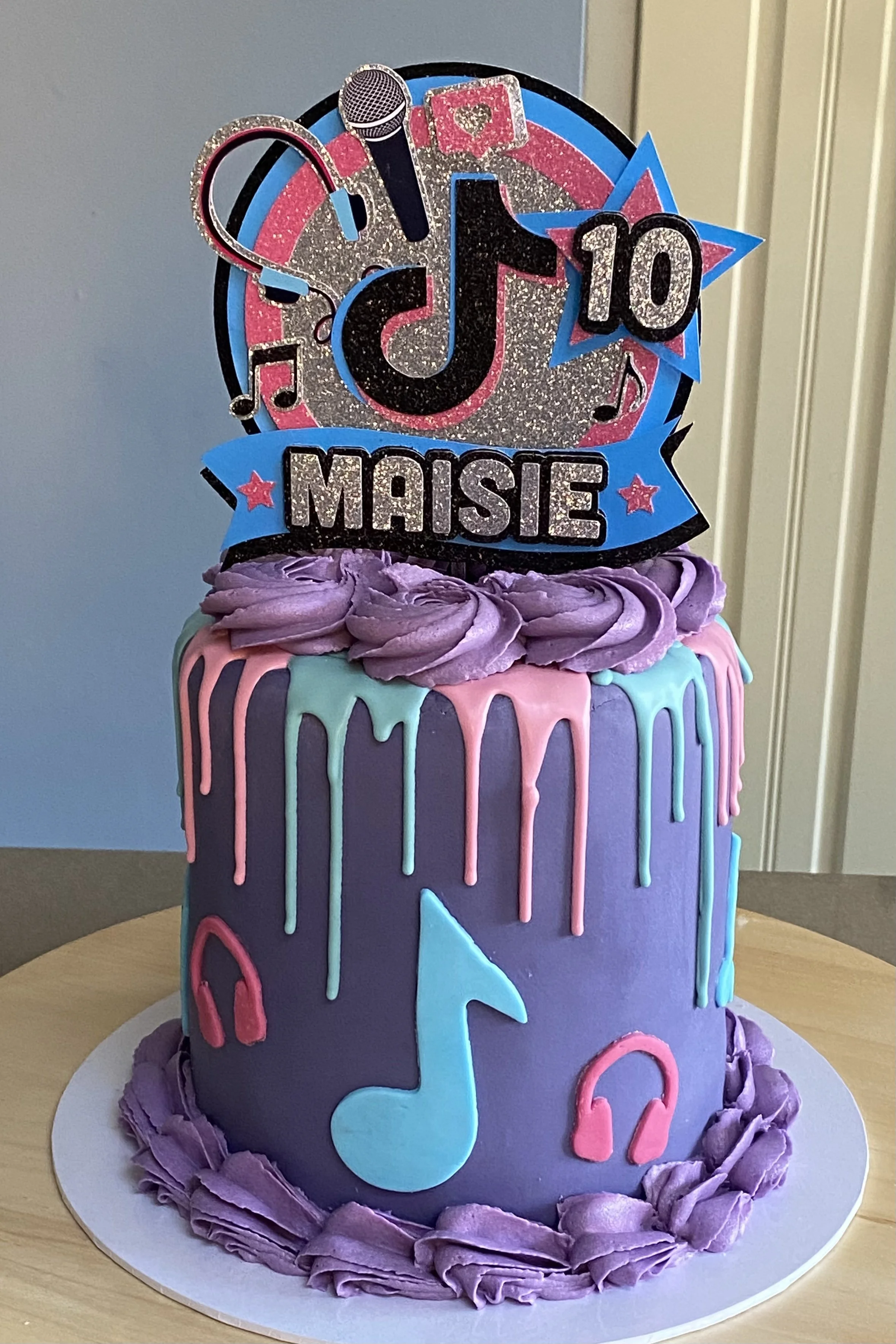 Tall Fondant Drip Cakes from £75 Music and Tic Tok theme together, purple pink and turquoise.