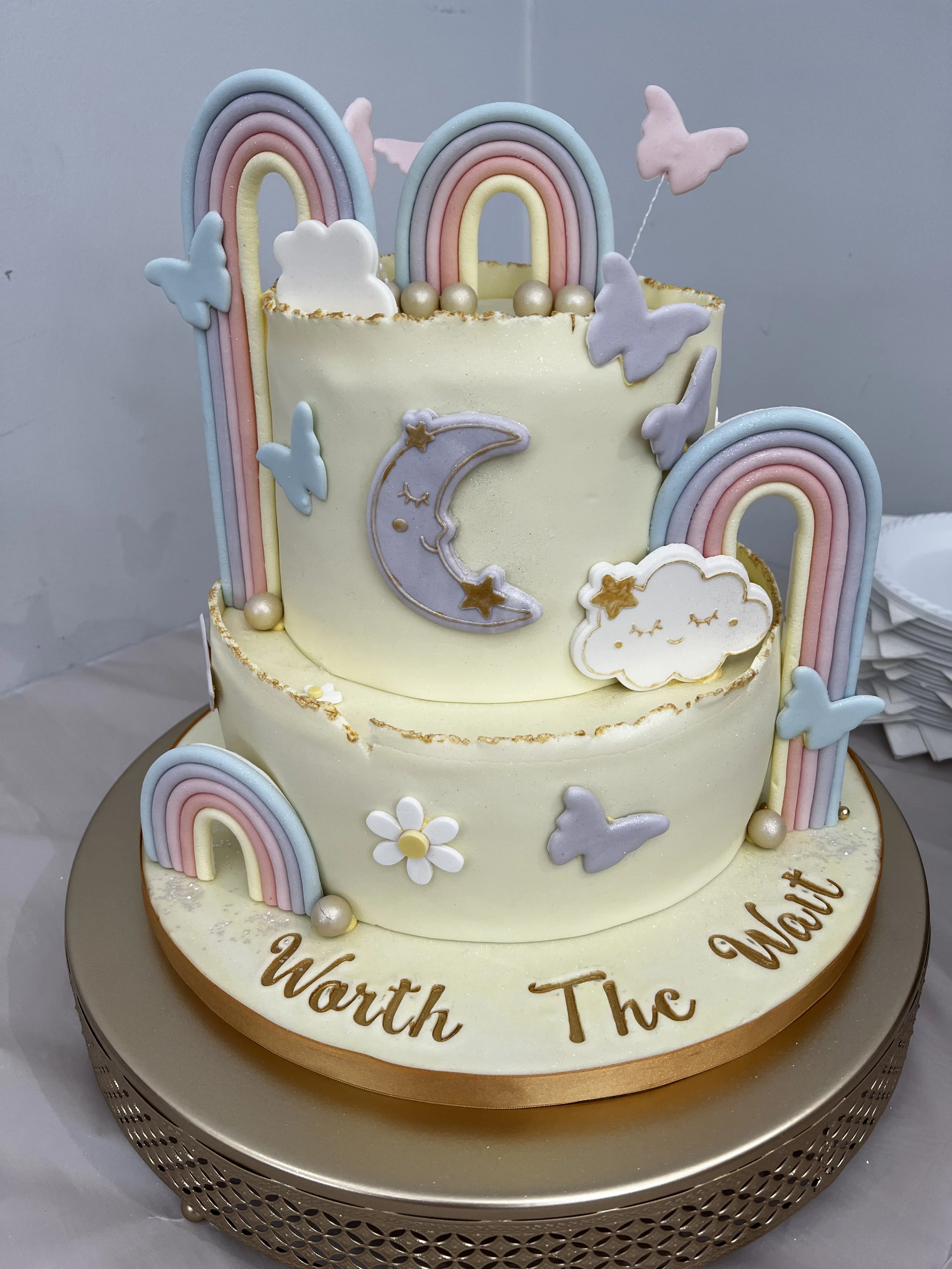 Worth the wait, Baby or Adoption Shower celebration cakes, with rainbows, butterflies and daisy design.