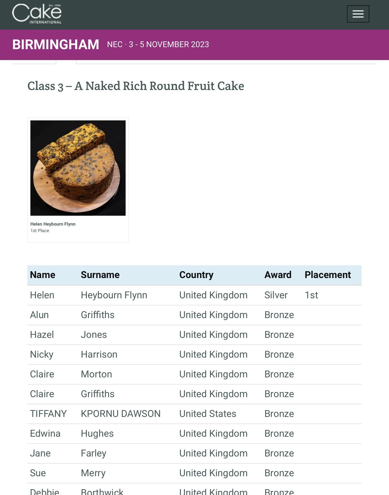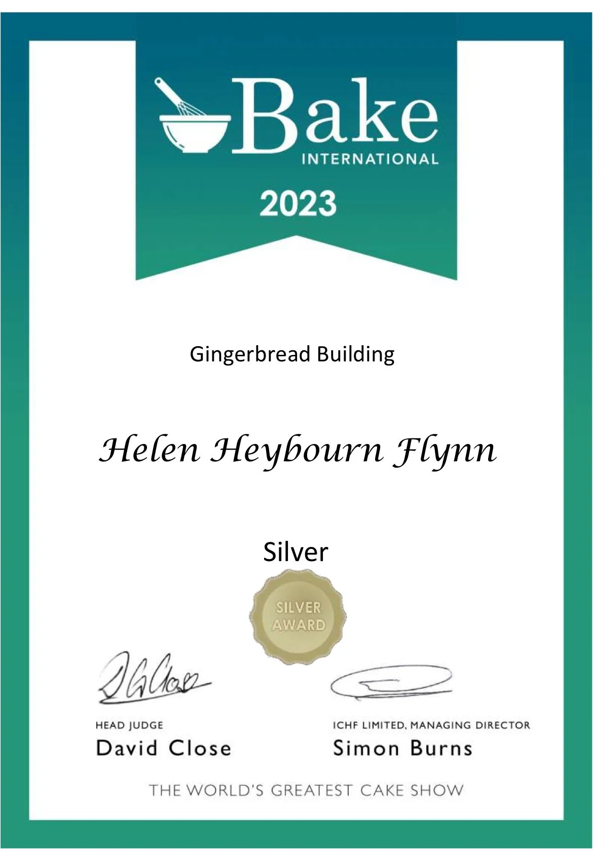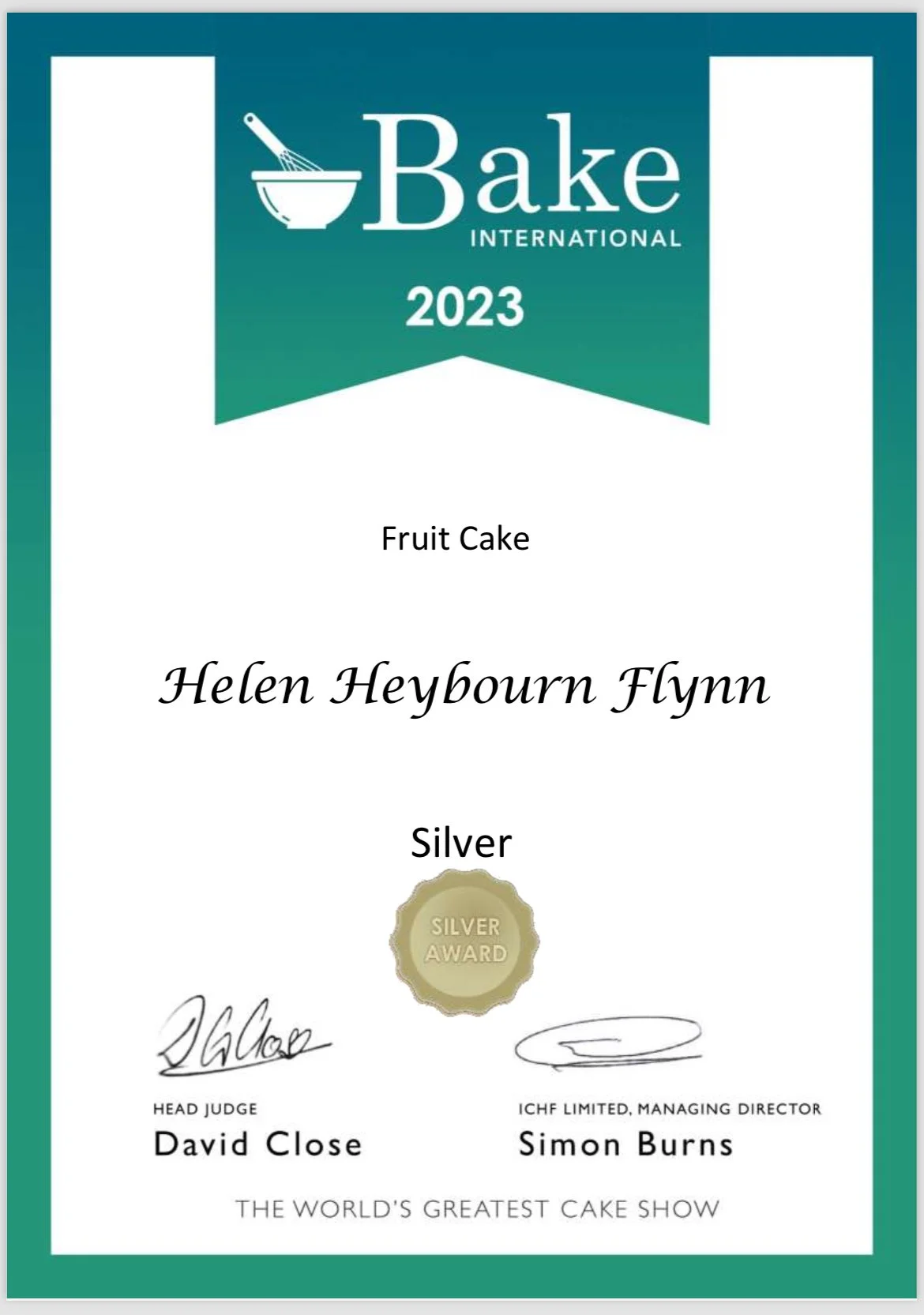 In November 2023 Helen became a multi award winning baker achieving 2 silver awards in the renown Cake/Bake International Competition gaining 1st and 3rd places in the two classes she entered.